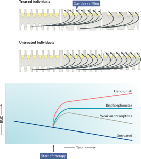Antiresorptive agents slow remodelling, thereby reducing the reversible deficit in bone volume, resulting in an early rapid increase in BMD, but the irreversible deficit in bone volume responsible for microstructural deterioration is not corrected.