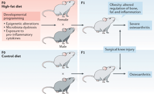Obesity promotes osteoarthritis (OA) through complex and incompletely understood biomechanical, metabolic and inflammatory factors. New data in mice add to this complexity by showing that eating a high-fat diet increases the risk of OA for two generations of offspring, raising questions about disease mechanisms and future treatment strategies.