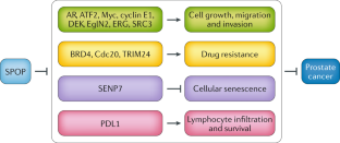 In prostate cancer, SPOP targets multiple oncoproteins, such as androgen receptor (AR), Cdc20, Myc, ERG, steroid receptor coactivator 3 (SRC3), PDL1 and BRD4, for degradation, whereas it controls the turnover of several tumour suppressors in renal cell carcinoma, including phosphatase and tensin homologue (PTEN), Daxx and DUSP7.