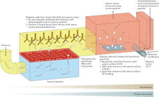 Sperm selection in the female reproductive tract (FRT) is sophisticated. Only about 1,000 sperm out of millions in an ejaculate reach the fallopian tube and thus have a chance of fertilizing an oocyte. In assisted reproduction techniques, sperm are usually selected using their density or motility, characteristics that do not reflect their fertilization competence and, therefore, might result in failure to fertilize the oocyte. Although sperm processing in in vitro fertilization (IVF) and intrauterine insemination (IUI) bypasses many of the selection processes in the FRT, selection by the cumulus mass and the zona pellucida remain intact. By contrast, the direct injection of a sperm into an oocyte in intracytoplasmic sperm injection (ICSI) bypasses all natural selection barriers and, therefore, increases the risk of transferring paternal defects such as fragmented DNA and genomic abnormalities in sperm to the resulting child. Research into surrogate markers of fertilization potential and into simulating the natural sperm selection processes has progressed. However, methods of sperm isolation — such as hyaluronic acid-based selection and microfluidic isolation based on sperm tactic responses — use only one or two parameters and are not comparable with the multistep sperm selection processes naturally occurring within the FRT. Fertilization-competent sperm require a panel of molecules, including zona pellucida-binding proteins and ion channel proteins, that enable them to progress through the FRT to achieve fertilization. The optimal artificial sperm selection method will, therefore, probably need to use a multiparameter tool that incorporates the molecular signature of sperm with high fertilization potential, and their responses to external cues, within a microfluidic system that can replicate the physiological processes of the FRT in vitro.