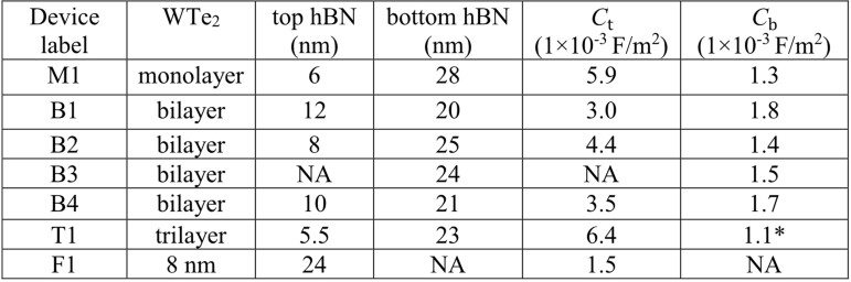Extended Data Table 1 Thickness of h-BN dielectrics and corresponding areal capacitances for the WTe2 devices