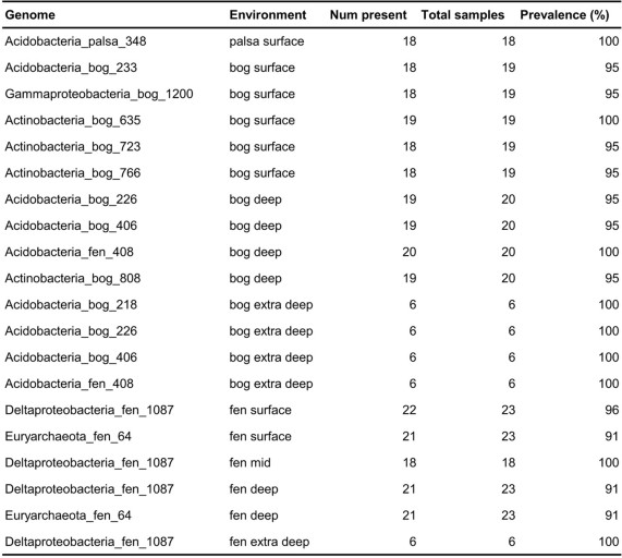 1. Genomes shown are representative genomes from the 97% dereplicated set that are present at >1% relative abundance in >90% of samples from the site and depth shown in the ‘Environment’ column. The ‘Num present’ column indicates the number of samples in which it is found and ‘Total samples’ indicates the total number of samples available for that environment.