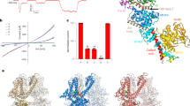 a, b, Alanine mutations were introduced within the ADPR-binding pocket and showed expression levels comparable to that of wild-type TRPM2, observed from both transfected cells (a) and fluorescence-detection size-exclusion chromatography (b). c, d, Electrophysiological experiments were carried out to measure the amplitude of agonist-induced current in inside-out patches pulled from HEK293 cells, with c showing the representative current and d showing the statistics of current amplitude and cell numbers. At +60 mV, robust current (4.87 ± 0.55 nA, n = 9 cells) could be detected when applying 0.1 mM ADPR and 1 mM Ca2+ onto inside-out patches expressing wild-type TRPM2. Single mutations (K154A, Y271A, E274A, R278A and R334A) each show robust channel activation (n = 5 cells, 8 cells, 8 cells, 7 cells and 8 cells for the corresponding mutants) and—other than K154A receptors, which did not show a markedly reduced current amplitude—mean current amplitudes for the mutated receptors were around two- to threefold smaller compared to the wild type. Introducing double mutations R278A/R334A (n = 7 cells) to the receptor nearly abolished ADPR/Ca2+-induced current. Deletion of the NUDT9-H domain (∆NUDT9-H) (n = 6 cells) also nearly abolished the ADPR/Ca2+-induced current. Data are shown as mean ± s.e.m.