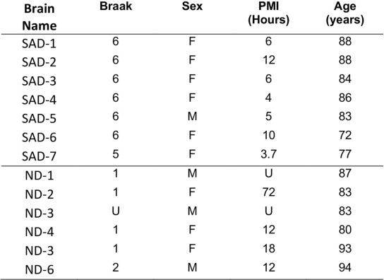 1. F, female; M, male; U, unknown; PMI, post mortem interval. All brains were from the pre-frontal cortex and obtained from the University of California San Diego Alzheimer’s Disease Research Center and the University of California Irvine Institute for Mind Impairments and Neurological Disorders.