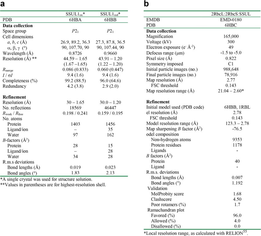 1. a, Crystallographic data collection, phasing and refinement statistics. b, Cryo-EM microscopy data collection, refinement and validation statistics for single-particle analysis.