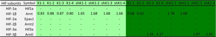 1. Protein levels of HIF family members in response to overexpression of FOXK1 (K1) or FOXK2 (K2) or knockdown of Foxk1 (shK1) or Foxk2 (shK2) in fully differentiated 3T3-L1 adipocytes based on analysis of proteomic dataset shown in Extended Data Fig. 6.