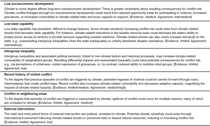 1. Expert judgments about the state of knowledge on climate–conflict linkages are characterized for the most-influential factors driving conflict risk in experiences to date (see Fig. 3a). The available knowledge basis for each climate–conflict linkage is described through the level of evidence and the degree of agreement37. This approach linking expert judgments to their basis in the underlying scientific literature draws from guidance iteratively developed for and applied in assessments by the IPCC35. Summary terms for the type, amount, quality and consistency of available evidence include limited, medium and robust. The degree of agreement is characterized as low, medium or high; the degree of agreement goes beyond consistency of evidence to consider the extent of established, competing or speculative explanations across the full scholarly community. The assessment input relevant to the summarized entries draws from both the individual expert-elicitation interviews and the group deliberation (see Supplementary Tables 1, 2 for the extended judgments about current knowledge).
