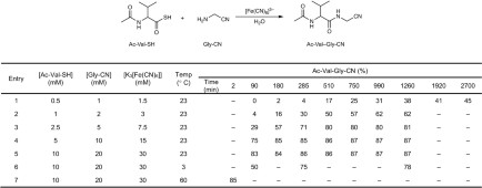 1. Yields of the oxidative coupling of Ac-Val-SH (1 equiv.) and Gly-CN (2 equiv.) with K3[Fe(CN)6] (3 equiv.) at specified concentration and temperature. 1H NMR yields determined with an internal NMR standard. (–) = not determined.