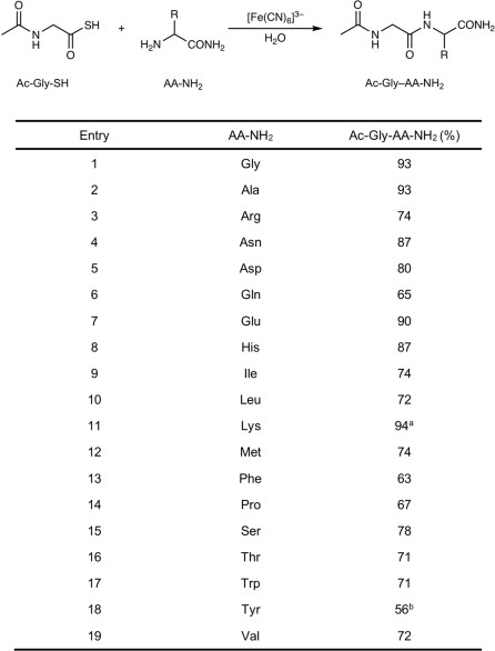1. Yields of the oxidative coupling of Ac-Gly-SH (50 mM) and AA-NH2 (150 mM) with K3[Fe(CN)6] (150 mM) in water at room temperature and pH 9.5. 1H NMR yields were determined with an internal NMR standard.