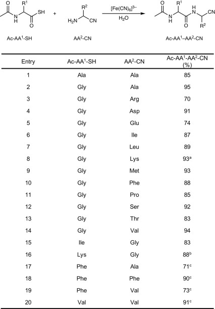 3. bYield for the coupling of Ac-Lys-SH (32 mM) with Gly-CN (64 mM) and K3[Fe(CN)6] (96 mM).