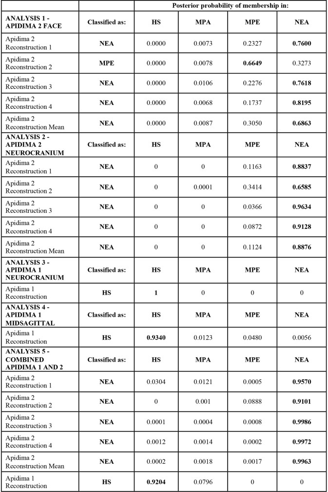 1. Classification of Apidima 1 and Apidima 2 reconstructions and posterior probabilities for analyses 1–5. HS, H. sapiens; NEA, Neanderthal.