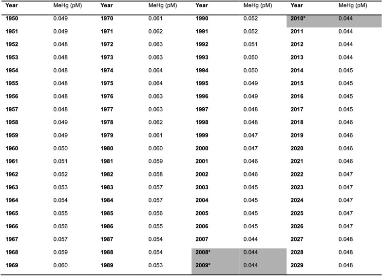 2. *Time series is based on average measured concentrations17 in the upper 60 m of the Gulf of Maine between 2008 and 2010 (grey shaded cells) and scaled by the trajectory in modelled total Hg in seawater between 1950 and 203024,25.