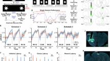 a−e, Average psychometric functions in unbiased, left and right bias blocks as a function of the odour percept (n = 67 sessions). The decision-variable model (a) and actual data from the same data (b) (replication of Fig. 1c) are shown. c, Odour sampling time was larger for small rewards than for large rewards. Errors are shown as mean ± s.e.m. (n = 3 rats). d, The model provides an excellent fit of choice patterns for each session. e, Choice driven by the relative value of left choice (replication of Fig. 1e). f, Histogram across sessions, comparing the ratio of actual reward obtained to a model relying on odour stimuli but ignoring reward size. g, Histogram across sessions, comparing the ratio of actual reward obtained to a model relying on reward size but ignoring odour stimuli. h−l, Same convention as a−e but reporting the bias arising from the outcome of the previous trial during the control block without reward bias (n = 67 sessions). h, i, The probability for left choice as a function of odour percept for all trials or separated by which choice (left/right) was rewarded in the previous trial. ‘Left reinforced’ indicates that rats are rewarded (correct) on the left side in the previous trial or not rewarded (error) on the right side, regardless of the stimulus conditions used in previous trials. The decision-variable model accurately predicts changes in choice probability (h, i) arising due to previous outcome. j, Odour sampling time was larger after a previously unrewarded choice than for a previously rewarded choice. Errors are shown as mean ± s.e.m. (n = 3 rats). The model provides an accurate fit across sessions (k) driven by the relative value of the left choice (l).
