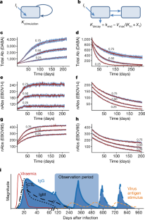 a, b, Plots for selected logistic growth model for antibody stimulation. a, Population predicted values. b, Individual predicted values. c, d, Plots for selected two-compartment decay model with saturable recycling for antibody stimulation. c, Population predicted values. d, Individual predicted values. Solid red circles represent the individual observed or model-predicted Ab values. Solid blue line and dotted red line represent the line of regression and line of unity, respectively.