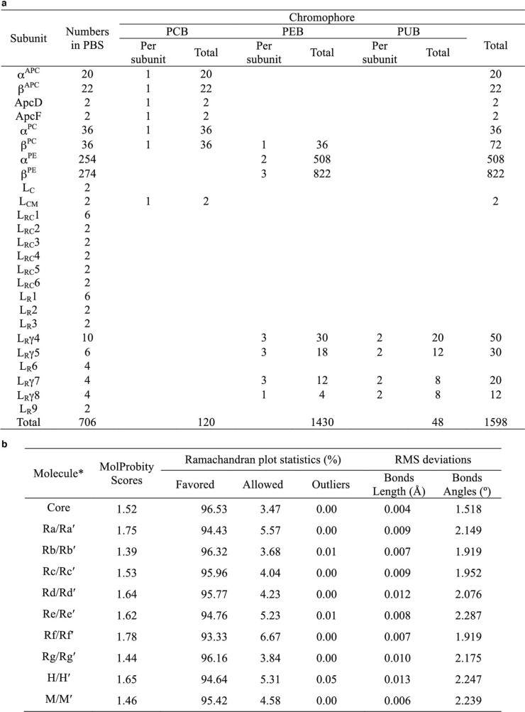 1. a, Numbers of proteins and chromophores in the PBS. b, Summary of model validation for the PBS components. *Core contains all α subunits, β subunits in core, and LC1/LC1′, LCM/LCM′, LRC4/LRC4′, LRC5/LRC5′ and LRC6/LRC6′; each rod (Ra/Ra′–Rg/Rg′) contains all α subunits, β subunits and linker proteins in the rod; H/H′ contains all extra hexamers (Ha/Ha′, Hb/Hb′, Hc/Hc′ and Hd/Hd′) including all α subunits, β subunits and linker proteins in the hexamers, and LR9/LR9′; M/M′ contains individual (αβ) monomers and all individual β subunits.