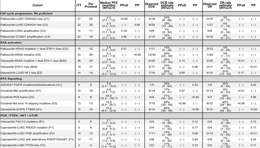 1. Number of patients in the intention-to-treat (ITT) and per protocol populations are shown. For OR and DCB, the observed number is reported together with the denominator that shows the number of patients currently with sufficient follow-up data to be included in the analysis. Bayesian estimates of the true OR rate and DCB rate, given the current data and minimally informative priors, are reported together with 95% credible intervals (CrI). For PFS, Bayesian estimates of the true median PFS in months, given the current data and minimally informative priors, are reported together with 95% credible interval. For closed cohorts, the Bayesian PP is reported for primary outcomes, showing the probability that the true value is greater than the pre-specified clinically relevant targets as follows: OR and/or DCB rates of 30% for B2S, A1, D2, G1, B1, F1–F4; median PFS of 3 months for C2 and C6. For open cohorts, the PPoS is reported for primary outcomes, showing the probability of a go decision when the cohort reaches n = 30, given the current observed data, with pre-specified clinical relevant targets as follows: OR and/or DCB rates of 30% for B2D, D1, D3, and 40% for E2; median PFS of 3 months for C1, C3–C5.