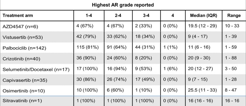 1. The table shows for each treatment arm, the number (and percentage) of patients with an adverse reaction reported at any grade (1–4), at grade 2 and above (2–4), at grade 3 and above (3–4) and at grade 4. For those patients with at least one adverse reaction reported, the table shows the median, interquartile range (IQR) and range for the number of adverse reactions per patient.