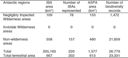 1. Areas of Antarctic IBAs and biodiversity-relevant ASPAs and numbers of biodiversity records from the Antarctic Terrestrial Biodiversity Database represented within Antarctica’s Negligibly Impacted Antarctic Wilderness, Inviolate Antarctic Wilderness and the non-wilderness areas excluded from the Negligibly Impacted Antarctic Wilderness. Total IBA and ASPA areas include marine and terrestrial areas.
