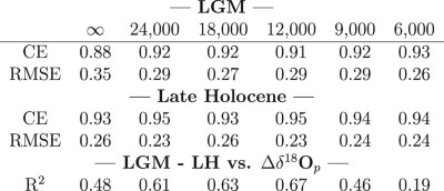 1. CE and RMSE are calculated on the 25% of the proxy data withheld from the assimilation. R2 is calculated between observed Δδ18Op, from speleothems and ice cores, and data assimilated Δδ18Op at the same locations. Cutoff radii are given in units of km; ∞ denotes no localization. Proxy variance R is held at Rg/5.