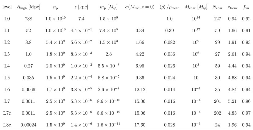 1. Column 1: name of the level; column 2: Rhigh, the radius of the high-resolution region; column 3: np, the total number of high-resolution particles; column 4: ε, the softening length of the high-resolution particles; column 5: mp, the mass of the high-resolution particles; column 6: σ(Mtot, z = 0), the r.m.s. linear overdensity, extrapolated to z = 0, within spheres that on average contain mass Mtot = npmp; column 7: \(\langle \rho \rangle /{\rho }_{{\rm{mean}}}\), the mean mass density at z = 0 in the high-resolution region in units of the cosmic mean; column 8: Mchar, the typical mass of the equilibrium haloes for which profiles were stacked in Fig. 2; column 9: Nchar, the number of haloes in the mass bin [0.8Mchar, 1.2Mchar] used in the stacks; column 10: zform, the median formation redshift of equilibrium haloes of the characteristic mass; column 11: fvir, the fraction of haloes with more than 3,000 particles that are in equilibrium according to the criteria given in the text.