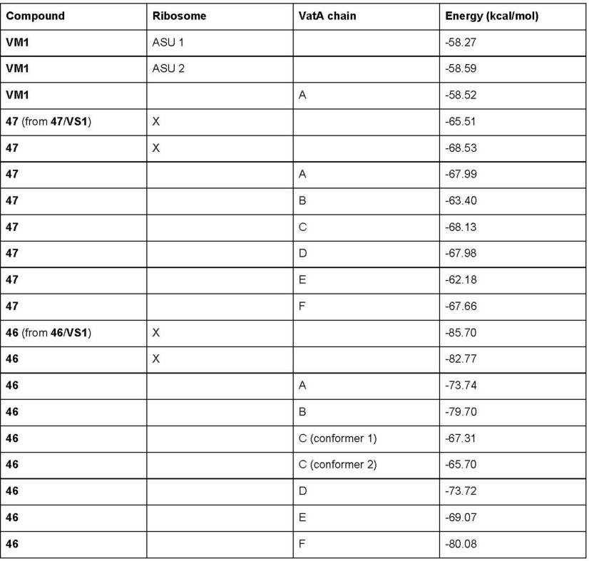 1. Energies of VM1, 46 and 47 bound to VatA or the E. coli ribosome, as evaluated by Prime with OPLS3e/VSGB2.1 after refinement with PHENIX-OPLS3e/VSGB2.1, where ligands are decoupled from the receptor environment. Included are VatA-bound VM1 from 4HUS and E. coli ribosome-bound VM1 from 4U25.