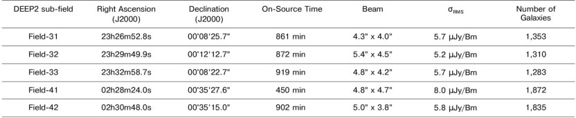 1. For each DEEP2 sub-field that was observed with the uGMRT 550−850 MHz receivers (column 1), the following columns provide the J2000 coordinates of the uGMRT pointing (column 2, right ascension; column 3, declination), the total on-source time (in min; column 4), the synthesized beam obtained in the continuum image (column 5), the r.m.s. noise (in μJy per beam) measured on the continuum image away from detected sources (σrms; column 6), and the number of galaxies from the sub-field that were included in the average MHi and SFR measurements (column 7).