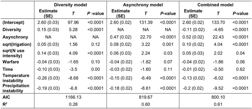 1. Linear regression models include crop diversity (diversity model), crop asynchrony (asynchrony model) or both (combined model) (n = 590). Caloric production stability was log-transformed, irrigation and nitrogen use intensity were square-root-transformed. Predictor variables were standardized to 0 mean and 1 s.d. across all nations and time intervals.
