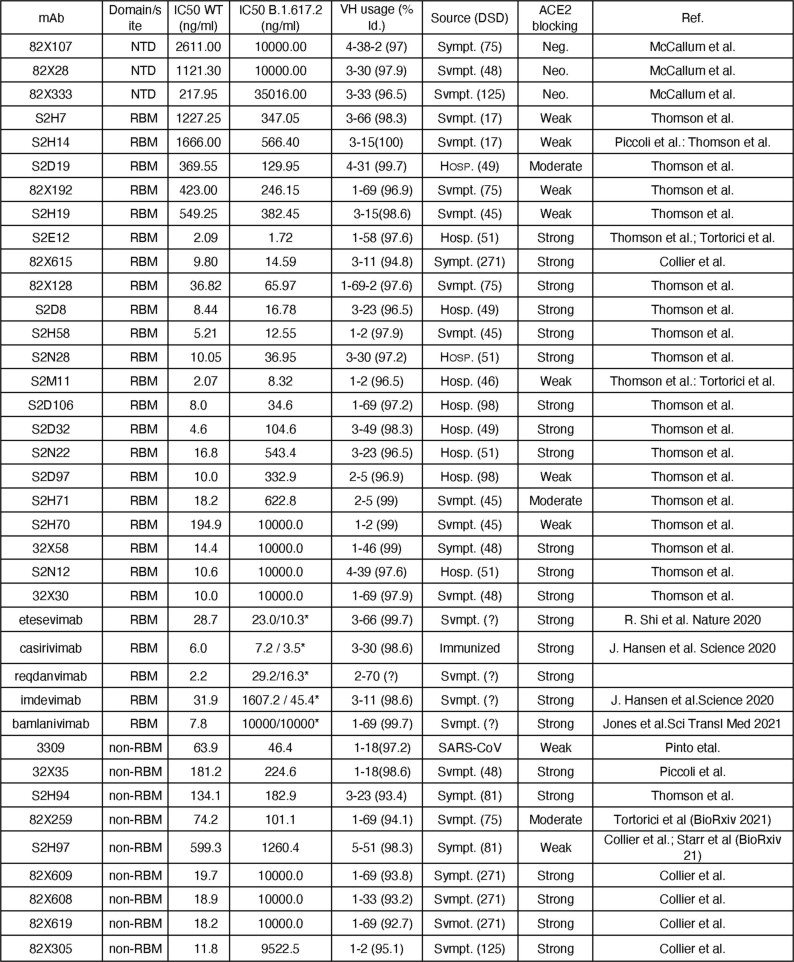 Extended Data Table 2 Monoclonal antibodies used in neutralisation assays against pseudotyped virus bearing spike from WT (Wuhan-1 D614) or B.1.617.2