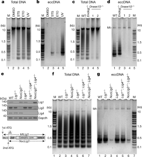 Extended Data Fig. 4 Effects of Endonuclease G, DNase γ, and DNA ligases knockout on apoptosis and eccDNA generation.