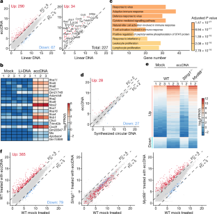 a–c, Scatter plot of pair-wise comparison of the transcriptomes of three independent BMDM samples of untreated (a), treated with eccDNA (b) or linear DNA (Extended Data Fig. 6). The x and y-axis are log2(FPKM+0.1). d, Scatter plot showing 380 genes (left panel, red dots) that are significantly induced (FC ≥ 5, adjusted p-value < 0.001; FC and p-value were generated using DESeq242 and p-values were adjusted by IHW43) by eccDNA, but not linear DNA, in BMDMs. 24 significantly induced cytokine genes are indicated (right panel, red dots). The x and y-axis are log2-transformed normalized read counts. e, Heatmap presentation of the top 20 induced genes. f, GO terms enriched in the genes activated by eccDNA treatment in BMDMs. The number of genes in each term and the p-value of the enrichment is indicated.