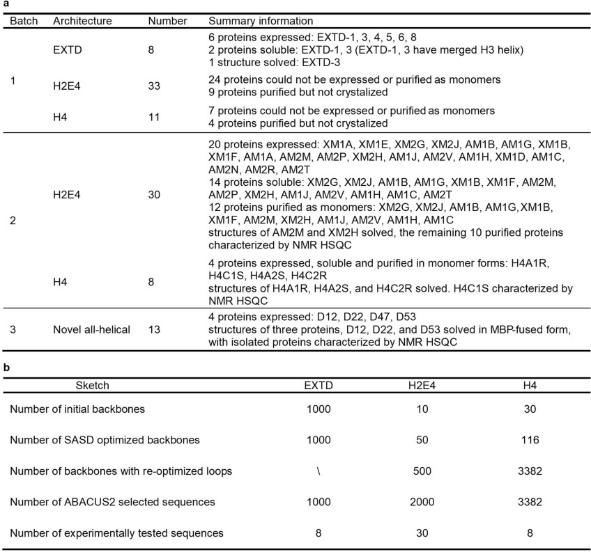 1. a, Summary information for the three batches of experimentally examined proteins. b, Numbers of generated or examined structures/sequences at different designing/testing stages for EXTD (Batch 1), H2E4 (Batch 2), and H4 (Batch 2).