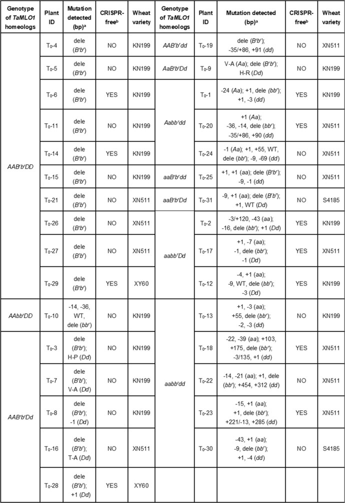 Extended Data Table 2 Genotypes of the mutants generated by CRISPR-Cas9 DNA in terms of mutations in TaMLO-A1, TaMLO-D1 and the large deletion in the B genome
