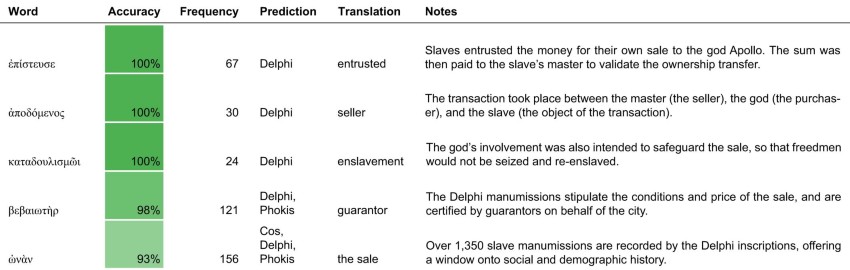 1. To discover underlying patterns in Ithaca’s predictions, we compute statistics to track the words that appear most frequently (“frequency”) in texts whose region Ithaca predicts correctly (“accuracy”). For each word of the test set, we compute an average accuracy, and a frequency of appearance. This visualization is intended to evaluate whether the occurrence of particular words could be correlated to the model’s geographical attributions.