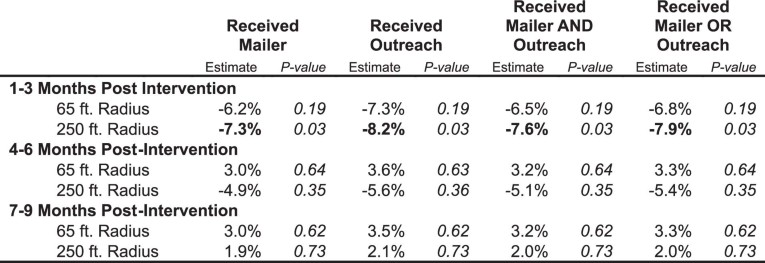 1. Specifications show the percent change in crimes per resident attributed to the intervention for four TOT analyses. For the “Received Mailer” analysis, treated corresponds to receiving NCO mailers (four randomly assigned treatment developments did not receive mailers). For the “Received Outreach” analysis, treated corresponds to receiving NCO outreach (11 randomly assigned treatment developments did not receive NCO outreach, while two randomly assigned control developments did receive NCO outreach). For the “Received Mailer AND Outreach” analysis, treated corresponds to receiving NCO mailers and NCO outreach. For the “Received Mailer OR Outreach” analysis, treated corresponds to receiving either NCO mailers, NCO outreach, or both. TOT analyses use two-stage least squares. P-values are from two-tailed tests.