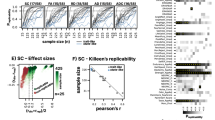 Replication is commonly defined as detecting a significant association (for example, P < 0.05) that was deemed significant (P < 0.05) in a previous sample (Fig. 3e). To determine the probability of replicating a brain–phenotype association in a new data (out-of-sample) at a given sample size, we correlated every brain feature (RSFC edge, cortical thickness vertex) with each behavioural phenotype in 1,000 bootstrapped samples across sample sizes (same sampling bins as listed under ‘Resampling procedures’). For each behavioural phenotype, sample size (n = 25, 33, 45, 60, 80, 100, 145, 200, 256, 350, 460, 615, 825, 1,100, 1,475 and 1,964 (1,814 for cortical thickness); note: data end at n ≈ 2,000 as the replication sample is half of the full), and bootstrapped subsample, we first determined the brain–behavioural phenotype associations that were significant (at P < 10−7 to 0.05) in the discovery (in-sample) dataset. Next, we extracted the same brain features from the replication (out-of-sample) dataset and quantified the percentage of associations that were also significant in the replication dataset. Note, to mirror a process of replicating existing effects, we used the number of identified significant associations in the discovery sample as the total number of features that could be replicated (as opposed to the total number of brain features regardless of discovery sample significance). For example, if all significant BWAS in the discovery sample were also significant in the replication sample, the probability of replication would be 100%.