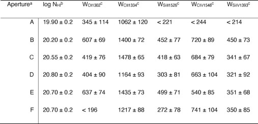 1. aAperture name as denoted in Fig. 1. bMeasured H i column densities from Voigt profile fitting. Errors are ±1σ uncertainties on column densities. cRest-frame equivalent widths of different metal absorption lines in units of mÅ. Errors are ±1σ uncertainties on equivalent widths. The < signs denote 2σ non-detection limits.