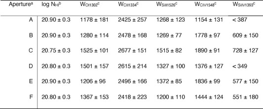 1. aAperture name as denoted in Fig. 1. bMeasured H i column densities from Voigt profile fitting. Errors are ±1σ uncertainties on column densities. cRest-frame equivalent widths of different metal absorption lines in units of mÅ. Errors are ±1σ uncertainties on equivalent widths. The < signs denote 2σ non-detection limits.