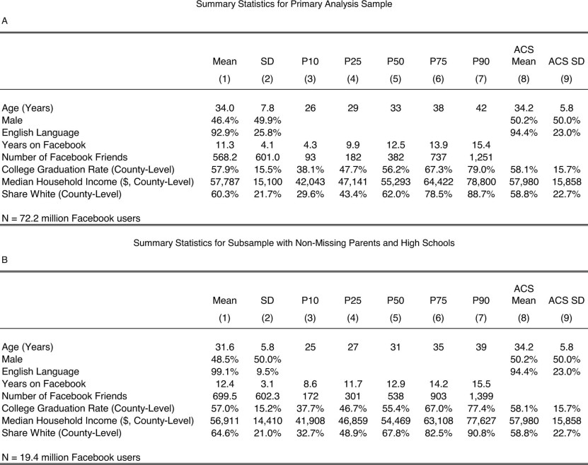 - Panel A presents summary statistics for our primary analysis sample, which consists of individuals between the ages of 25 and 44 as of May 28, 2022 who reside in the United States, have been active on the Facebook platform at least once in the previous 30 days, have at least 100 US-based Facebook friends, and have a non-missing residential ZIP code. Panel B replicates Panel A for the sample used to measure childhood economic connectedness—users whom we can link to parents with valid SES predictions (see Supplementary Information A.2) and assign a high school (see Supplementary Information A.3). For each variable, columns 1-7 present means, standard deviations, and selected percentiles. Columns 8 and 9 report means and standard deviations for the corresponding variables using the nationally representative 2012-2016 American Community Survey (ACS) for median household income and the 2014-2018 ACS for the remaining variables. Age and gender are self-reported by individuals. English Language refers to whether users set their language to English in the Facebook data and to the share of individuals who speak English only or speak English “very well” in the ACS data. Years on Facebook and Number of Facebook Friends are only observed in the Facebook data. In both panels, we report the number of Facebook friends within our primary analysis sample, as opposed to the total number of Facebook friends. The remaining variables are obtained from the 2014-2018 American Community Survey (ACS) and are assigned based on an individual’s residential county. The ACS means for these variables are population-weighted averages of the same county-level variables.