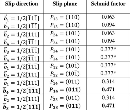 Extended Data Table 2 Schmid factors of the different slip systems for a \(\left[\bar{{\rm{1}}}{\rm{05}}\right]\) tensile axis