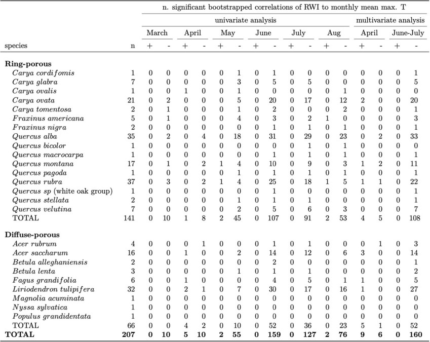 Extended Data Table 3 Summary of tree-ring chronologies analyzed and number of significant (at significance level = 0.05) positive or negative correlations of ring width index to monthly Tmax in univariate and multivariate analyses