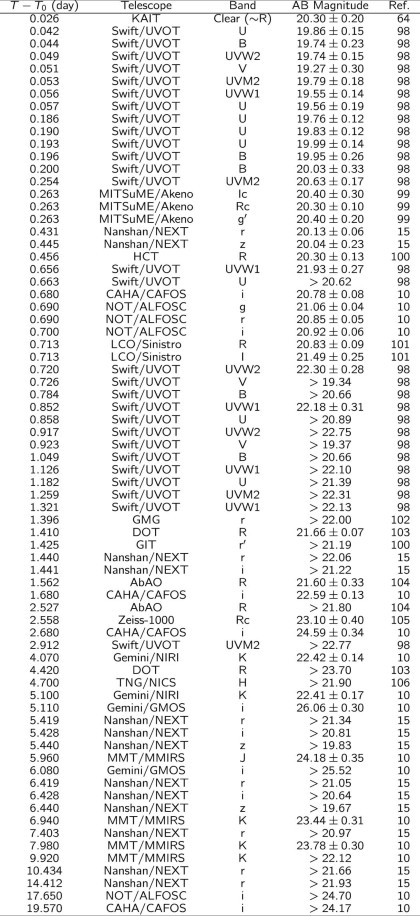 1. Correction for foreground galactic extinction is not applied to the observed magnitude values listed in this table, which wasimplemented in the fitting process. Upper limits are given at 3σ level.