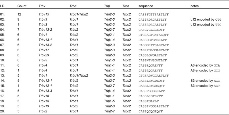 1. For 3 pairs of CDR3, the pair members are separate clonotypes developing from unique nucleotide sequences. The Count parameter represents the number of high quality, validated reads for a unique clonotype. Clone I.D.’s 14 and 15 encode a sequence already established as the CDR3 of the N15 TCR β chain known to recognize VSV8 peptide presented by H-2Kb both as a mature TCR including the N15 α chain and as a component of the preTCR10.
