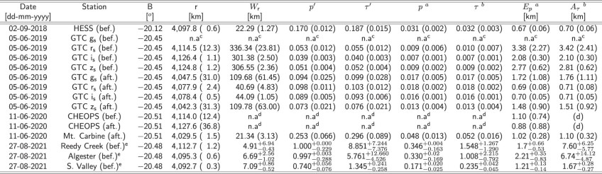 1. aAssuming a monolayer ring. bAssuming a polylayer ring. cThe light curve S/N does not allowed the detection of the ring. dThese values are not available as the ring is unresolved, only the Equivalent Width (Radial Width × Normal opacity) can be computed. eDue the small number of points within each detections, the 1-sigma uncertainty has a large asymmetry.