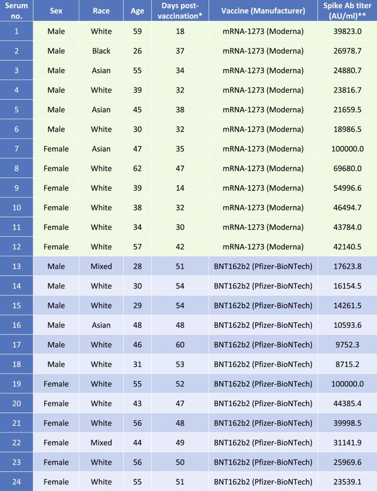 1. Overview of serum samples used for the analysis of antibody neutralization of WA1, Omi-S and Omicron. *Days after the second vaccine shot. **The spike antibody titre was measured by Abbott’s SARS-CoV-2 immunoassays.