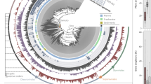 The amino acid sequence datasets for RNApolA, RNApolB, DNApolB and TFIIS were manually curated through BLASTp alignments (BLAST55 v2.10.1) and phylogenetic reconstructions, as previously described for eukaryotic hallmark genes20. Briefly, multiple sequences for a single hallmark gene within the same MAG were inspected on the basis of their position in a corresponding single-protein phylogenetic tree generated using the same protocol as described above (section entitled Diversity of DNA-dependent RNApolB genes). The genome’s multiple sequences were then aligned with BLASTp to their closest reference sequence, and to each other. In case of important overlap with >95% identity (probably corresponding to a recent duplication event), only the longest sequence was conserved; in case of clear split, the sequences were fused and accordingly labelled for further inspection. Finally, RNApolA and RNApolB sequences shorter than 200 amino acids were also removed, as well as DNApolB sequences shorter than 100 amino acids, and TFIIS sequences shorter than 25 amino acids. This step created a set of curated hallmark genes.