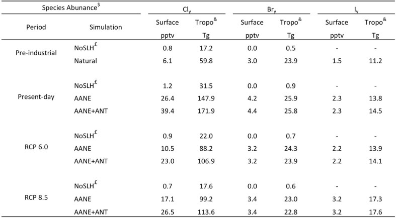 Extended Data Table 3 Global mean surface mixing ratio and tropospheric burden of inorganic halogens