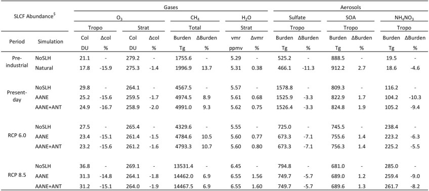 Extended Data Table 4 Global mean tropospheric and stratospheric abundance of main short-lived climate forcers
