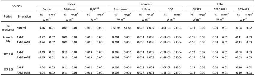 Extended Data Table 5 SLH-driven radiative effect for the main gas-phase and aerosol short-lived climate forcers