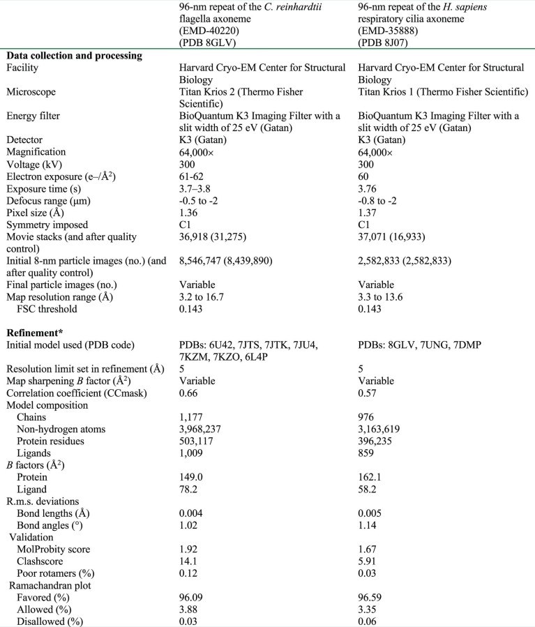 1. *Refinement and validation statistics for the 96-nm repeat of the C.reinhardtii flagella axoneme are the average (mean) of values generated after splitting the model into three regions and running each separately through Phenix.real_space_refine. Attempts to calculate statistics for the intact complex failed because of insufficient memory. The human 96-nm repeat is smaller and was refined as a single model.