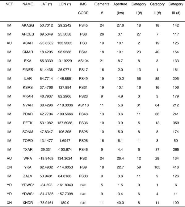 1. The columns LAT and LON give the array reference point. The aperture of the array is calculated from the maximum distance between a sensor pair in the array. YDWG and YDWS together compose the Antarctic array YDW (Extended Data Fig. 1).